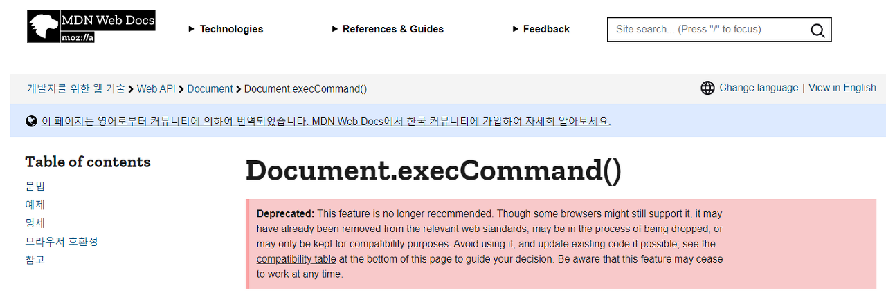Clipboard에 복사하는 방법은 전통적으로 document.execCommand('copy') 방식을 써왔다.