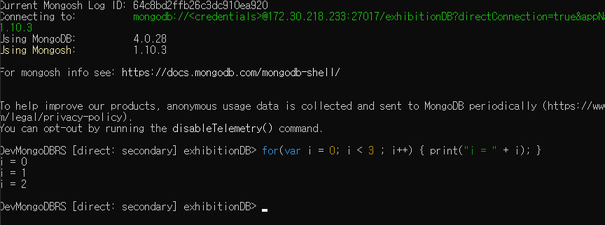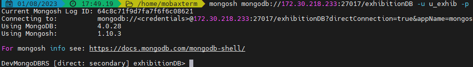 mongosh 명령어를 이용해 접속정보와 DB, -u 유저, -p 비밀번호를 입력하면 접속이 된다.