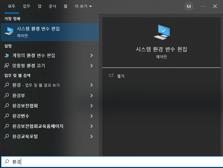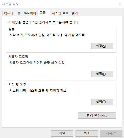 시스템 환경 변수 편집으로 들어가 '환경 변수'를 클릭해 준다.