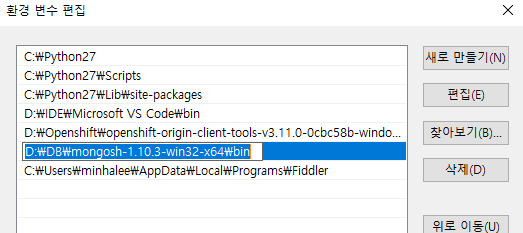 방금 설치한 mongoDB Shell의 위치 폴더 경로를 입력해 준다.