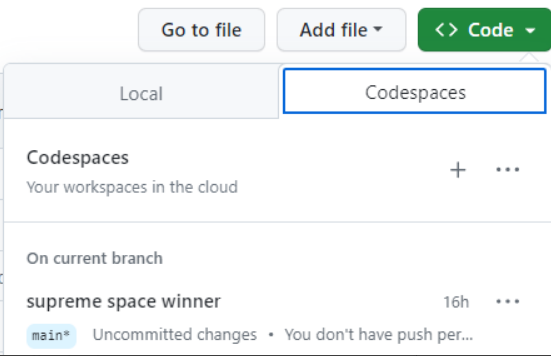 코드 버튼 클릭 후 Codespaces 탭에서 새 Codespaces를 생성하면 됨.