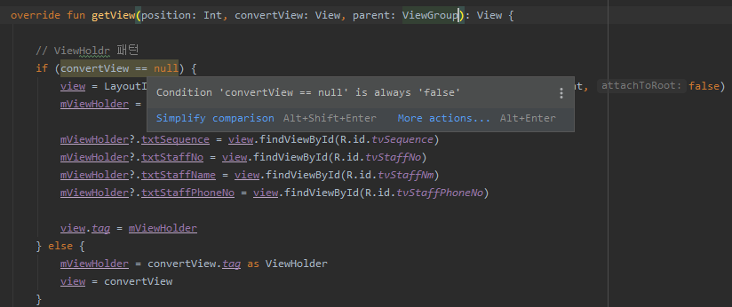 처음 컨버젼을 할 때 아래와 같이 뜨길래 뭣도 모르고 Simplify 눌러줬는데 그러면 if (convertView == null) 일 때의 코드가 다 날아가 버린다.