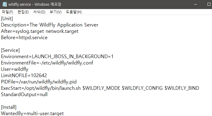 WildFly를 편하게 실행하기 위해 service로 등록을 해두었는데 WildFly_HOME 근처에 systemd 폴더를 찾아보니 wildfly.service 파일을 발견했다.