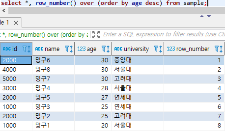 select *, row_number() over (PARTITION by university order by age desc) from sample;