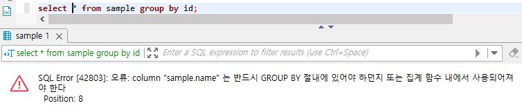 group by 절을 아래와 같이 사용한다면 SQL Error 가 발생한다.