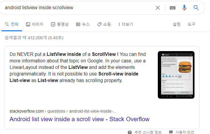 따라서 해결하려면 ListView의 높이를 재측정하여 파라미터로 ScrollView에 알려줘야 한다.