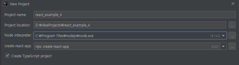 프로젝트 이름은 'react_example_1' 실패할 때마다 뒤에 붙은 숫자가 올라갈 것이다..!