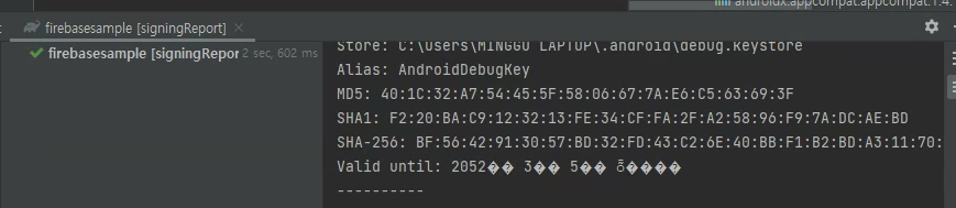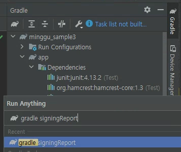 Android Studio 우측에 Gradle 버튼을 클릭한 후 gradle signingReport라고 입력하면