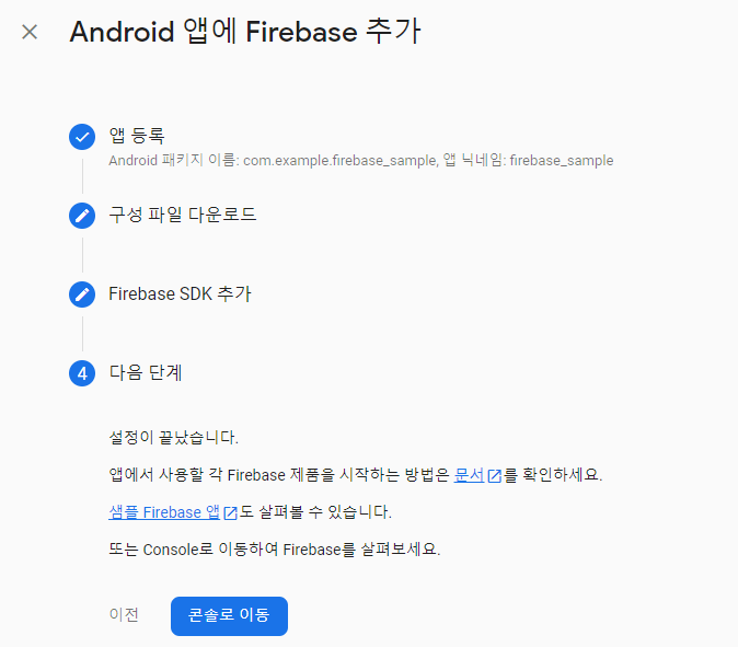 홈 화면에서 '앱에 Firebase를 추가하여 시작하기 - Android' 로고를 선택
