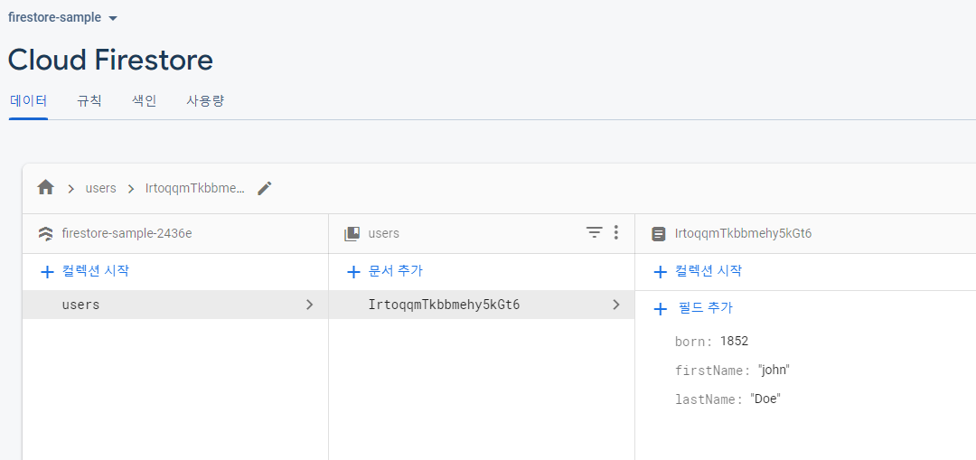 Cloud Firestore는 컬렉션에 저장되는 문서에 데이터를 저장합니다. 문서에 데이터를 처음 추가할 때 Cloud Firestore에서 암시적으로 컬렉션과 문서를 만듭니다. 컬렉션이나 문서를 명시적으로 만들 필요가 없습니다.