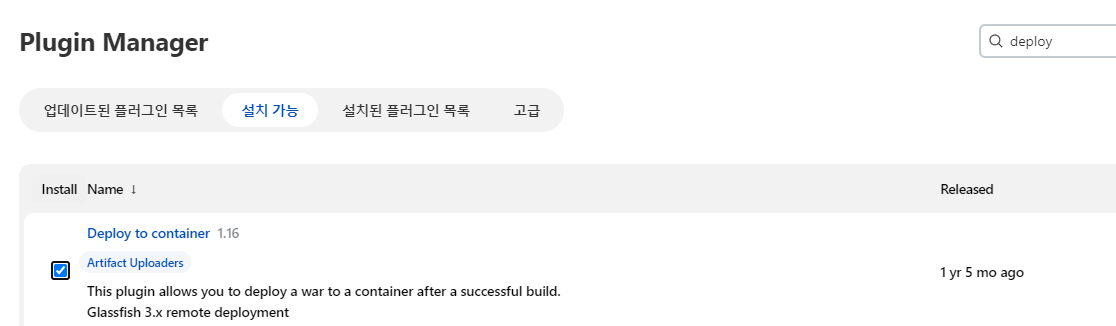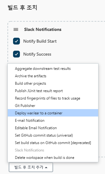 Deploy to container를 설치해주자. Subversion과 Slack Notification도 설치 안 했다면 고고