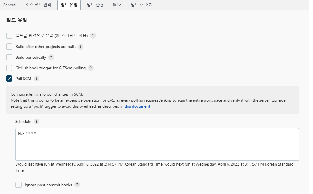 Build Trigger는 매 3분마다 Push 된 내역이 있으면 자동으로 빌드 진행할 수 있도록 스케줄링 해주자.